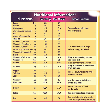 It contains Protein (which helps in maintenance and growth of muscle mass), Vitamin B12/B2 (which is essential for maintaining a normal function of the nervous system) and Iodine/Iron (which support normal cognitive functions.