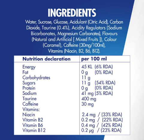 Red Bull Energy Drink is a functional beverage and its formula contains high quality ingredients: Caffeine, Taurine, some B-group Vitamins, Sugars and Alpine water