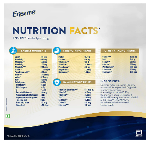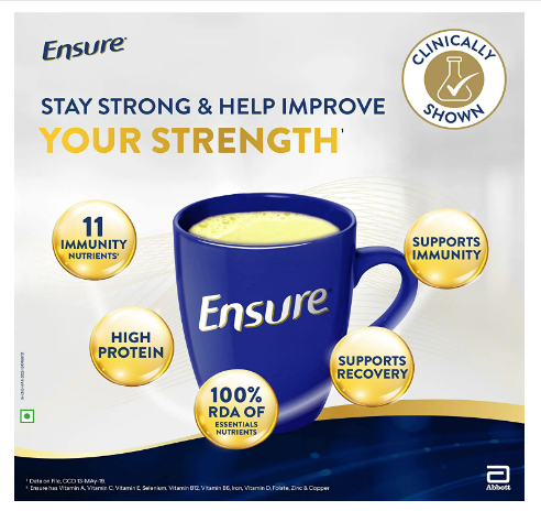 MUSCLE STRENGTH: Ensure helps you revive muscle strength as you age as it is a source of protein and other 32 nutrients including HMB to help build muscle and strength.;IMMUNITY: Ensure helps build immunity as it contains 11 immunity nutrients which are Vitamin A, Vitamin C, Vitamin E, Selenium, Vitamin B6, Iron, Vitamin D, Folate, Zinc & Copper.