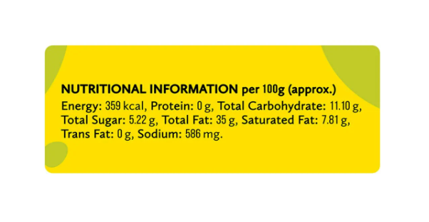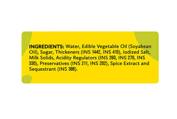 • Material Features: Vegetarian; Ingredients: Edible Vegetable Oil(Soyabean Oil),Water,Sugar,Iodized Salt,Milk Solids,Thickeners(Ins 1442,Ins 415),Acidity Regulators (Ins 260,Ins 270,Ins 330),Preservatives(Ins 202,Ins 211),Spices Extracts And Sequestrant(Ins 386)