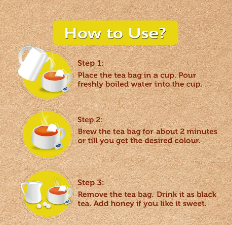 EASY TO MAKE: Place the tea bag in a cup. Pour freshly boiled water into the cup. Brew the tea bag for about 2 minutes or till you get the desired colour. Remove the tea bag. Drink it as black tea. Add honey if you like it sweet.