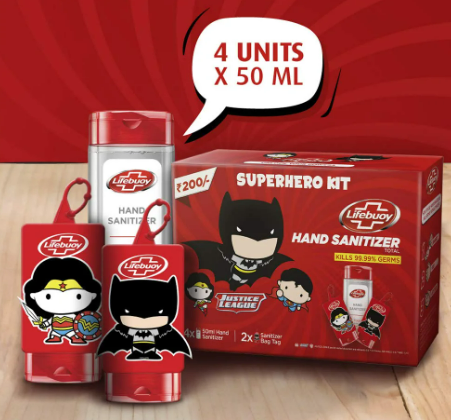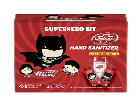 Introducing Lifebuoy Hand Sanitizer Super Hero Kit that contains 4 units x 50 ml of Lifebuoy Total Hand Sanitizer with 2 Super Hero Bag Tags of Wonder Woman & Batman.