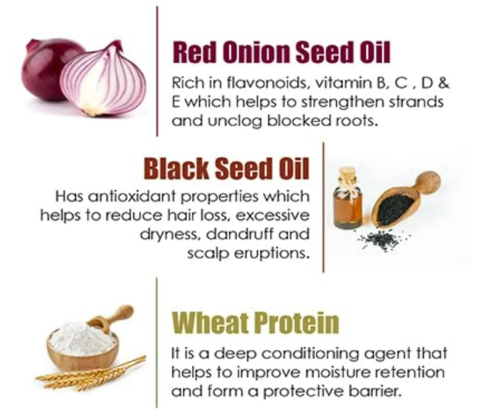 This red onion extract and black seed oil infused in the shampoo, conditioner & hair oil improves circulation to the scalp and roots.