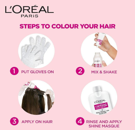 Contents: 1x L'Oréal Paris Casting Crème Gloss Semi-Permanent Hair Dye, with Colourant, Developer Crème, Conditioner and Disposable Gloves, Glossy Finish, Ebony Black 200