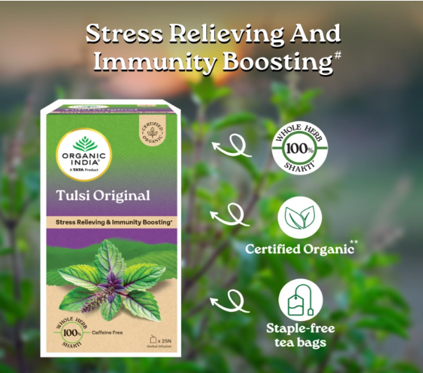 A TATA Product - Organic India Tulsi Original - 25 Tea Bags, Caffeine-Free Herbal Tea with Tulsi, Natural Detoxifier, Rich in Antioxidants, Convenient Staple-Free Bag