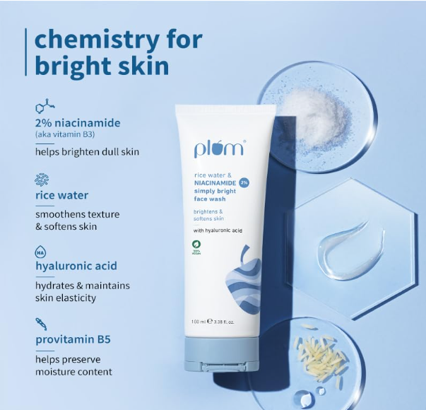 Plum 2% Niacinamide Simply Bright Face Wash With Rice Water 100 ml | Brightens Skin, Helps Fade Blemishes | Softens & Smoothens Skin | Gentle & Non-Drying | Women & Men | 100% Vegan