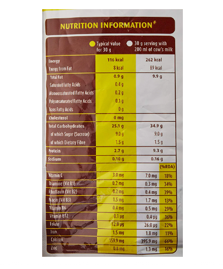 30g Kellogg's Chocos + 200ml cow's milk provides 66% of the day's RDA for Calcium and 32% of the day's RDA for Protein.