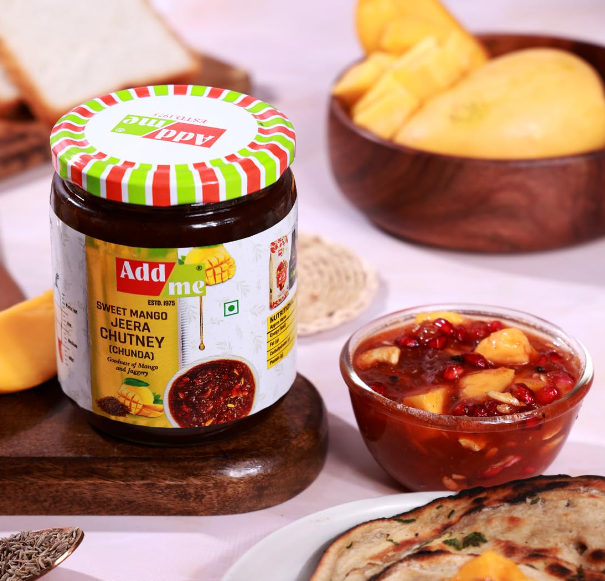 Package InformationJarDiet TypeVegetarianItem FormPickle in JarPackage Weight0.88 KilogramsItem Weight600 GramsNumber of Pieces1SpecialityNatural & Chemical-free Ingredients.BrandAdd meFlavourSweet Mango Jeera Chutney (Chuunda)