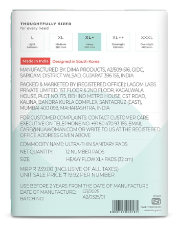 BrandNuaSanitary Napkin TypeMenstrual PadStyleSanitary PadsSanitary Napkin AbsorbencyHeavySizeXL+ReusabilityDisposableMaterialNon-wovenMaterial Type FreeFragrance FreeMaterial FeatureFragrance FreeNet Quantity12 Count