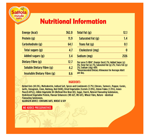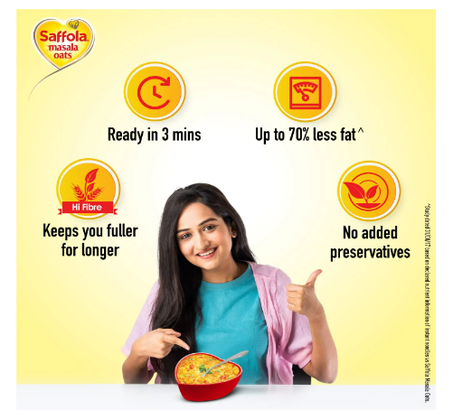 Made with wholegrain Oats & real vegetables, Saffola Masala Oats is high in fibre and protein keeping you fuller for longer, helping you control your hunger pangs and manage weight