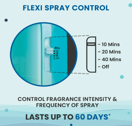 • FLEXI SPRAY: Eliminate unpleasant odour by controlling the intensity of the fragrance by switching between 3 options - 10 min, 20 min and 40 min