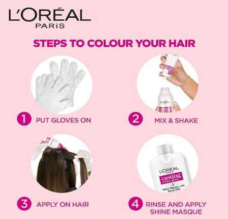To Apply: Conduct a patch test 24 hours before use. Wear the gloves provided, pour coloring crème into developer bottle and shake. Apply Colour evenly on your hair. Wait 20 mins and rinse. Apply masque. Enjoy you silky, smooth gorgeous hair.