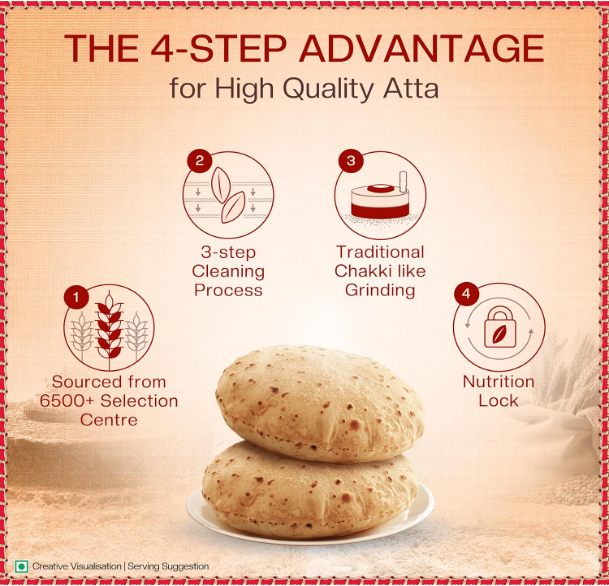 • FINEST QUALITY ATTA: The 4-step advantage process of sourcing, cleaning, grinding and nutrition lockage ensures high-quality atta