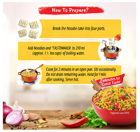 • Contains a noodle cake and the Favourite Masala Tastemaker inside, for a quick 2 minute preparation